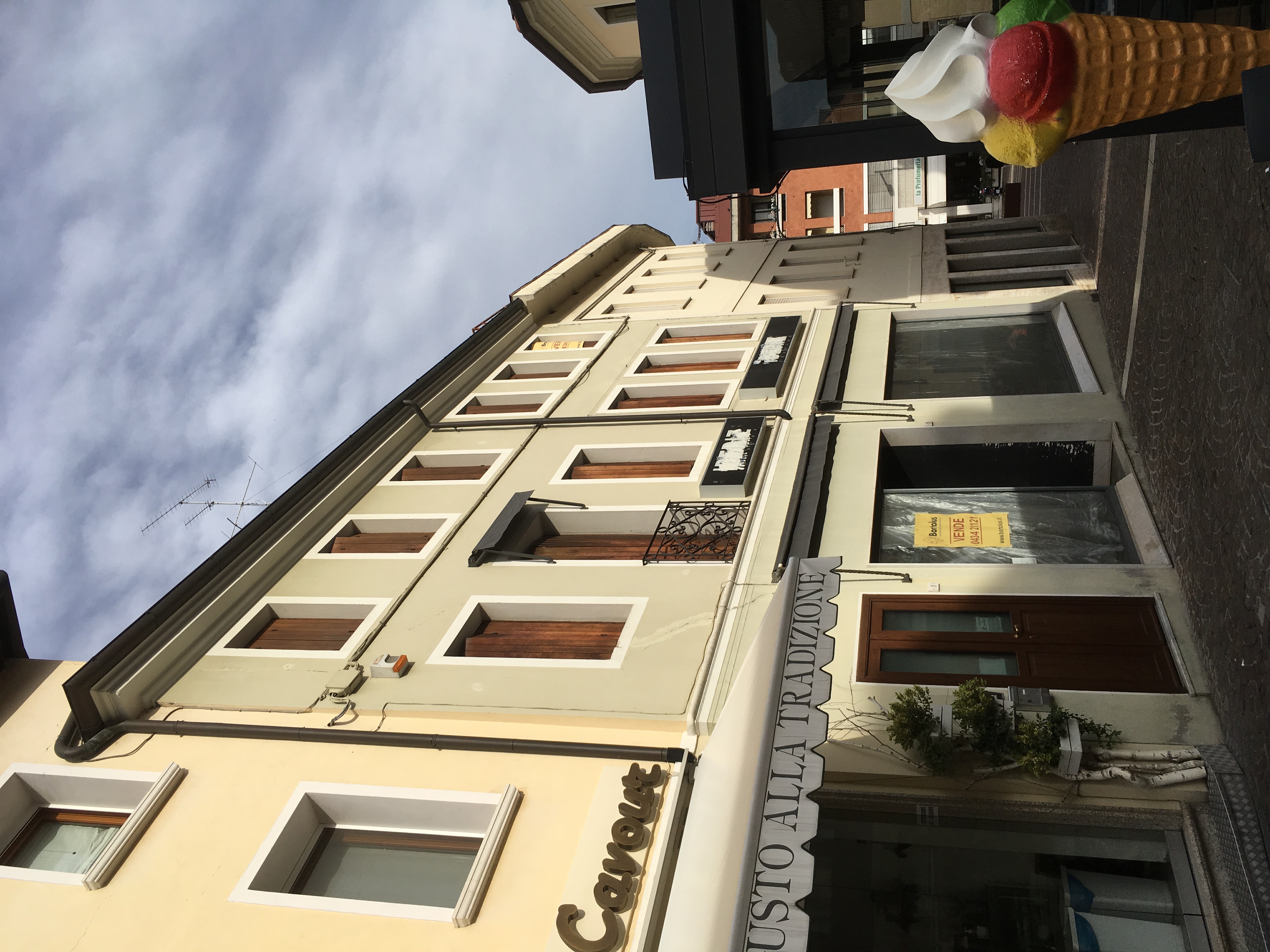Vendiamo a Pordenone, Pizzetta Cavour, negozio su due piani di complessivi 180 mq e appartamento mansardato al secondo piano di 55 mq con terrazzo di 30 mq.
